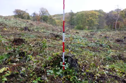 主伐が終わり植え付けを開始する前に行う作業のことで、林地内の雑草木を刈払機やチェンソーで取り除きます。取り除いた雑草木を等高線なりに緩傾斜では重機、急傾斜では人力で棚のように積み上げて片付けます。地ごしらえは、植え付けや、その後の保育作業(下刈りや除伐など)の効率や安全面にも関わる大切な作業となります。近年は主伐後すぐに植え付けを行う一貫作業が増加しているため、地ごしらえも作業しやすくなりました。