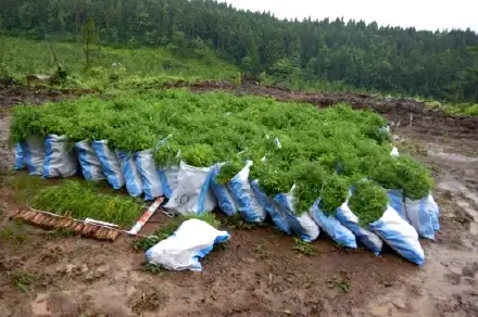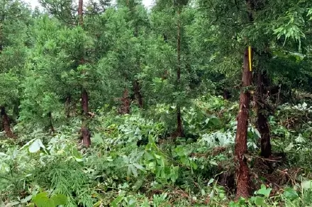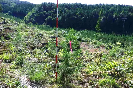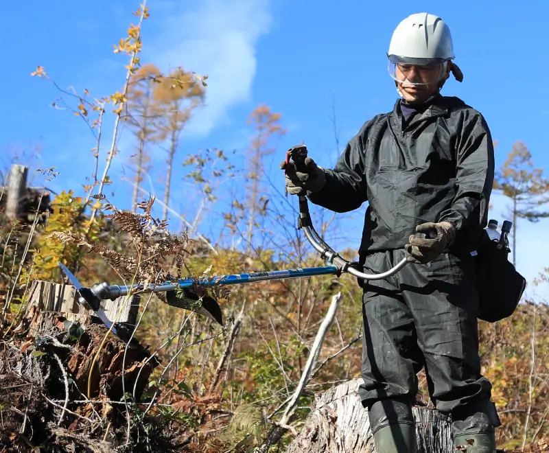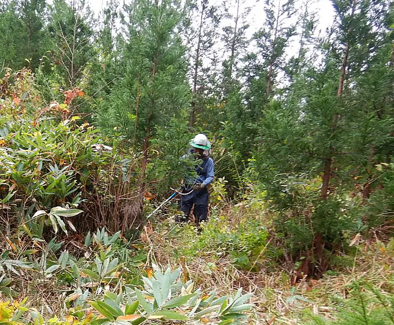 植え付け後の約5年の間に行い、植栽木の成長を阻害する雑草木を刈り払い、植栽木を健全に育てるための作業のことで、夏季(弊社では6~10月)に行います。暑い時期に行う作業なので業界の中で最も過酷な作業とも言えます。しかし、下刈りすることにより綺麗な林となり気持ちがいいです。また、年数を重ねる度に自分たちで植えた木の成長を見ることができることが魅力とやりがいでもあります。グループ会社のグリーンフォレスト仁賀保と合わせて年間100ha以上の下刈りを行っております。