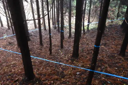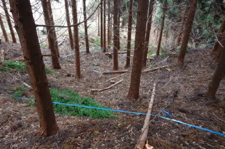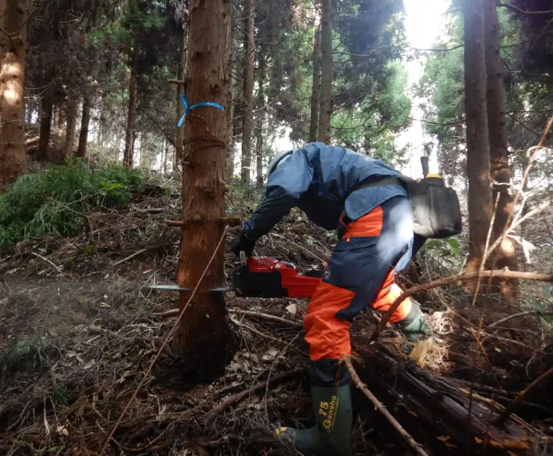 森林の成長に応じて植栽木の一部をチェンソーを使用して伐採し、林内密度を調整する作業のことで、日光が地表に届くことにより、下層植生の発達が促進され森林の持つ多面的機能が増進します。また、間伐後に残った植栽木が健全に成長することによって、木材価値も高まるため、間伐は重要な作業となります。
